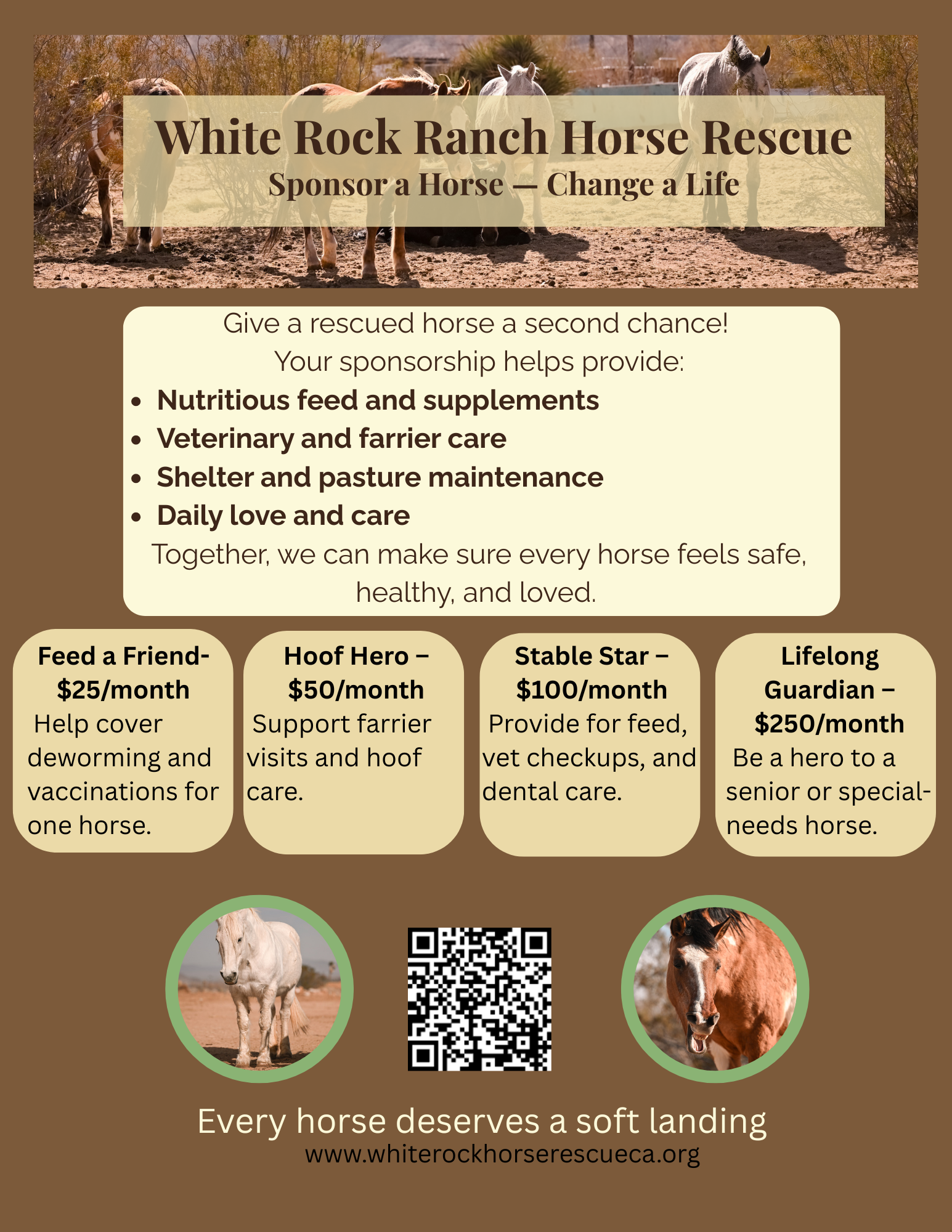 White Rock Ranch Horse Rescue and Retirement is a non profit 501(c)3 located in the high desert of Yucca Valley.